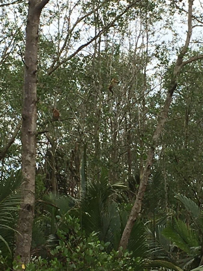 The highlight of the trip was a visit to an area where we saw Proboscis Monkeys in the wild. We piled into boats along with Chinese tourists (it was Chinese New Year) and floated gently past an island where the monkeys swung in the branches of the trees. If you look carefully at the pictures you can see them. At one point a baby missed its branch & fell but the Mother caught it. Some things don’t change between the species.