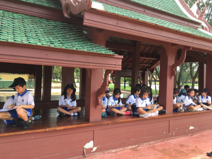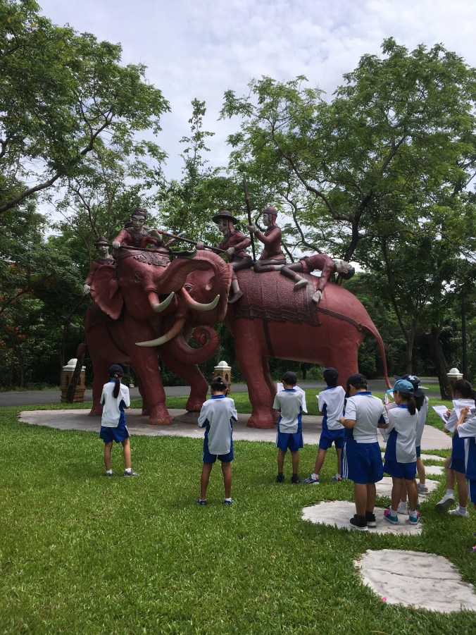 In order to be able to take some older children to Kidslit – a reading competition, in October, I need to have experience of assisting on a school trip beforehand . Hence my assistant Marivic and I found ourselves helping out on the Year 3 visit today to the Siam ancient city, park located about 50 mins away from the school.
