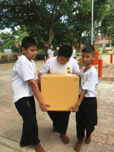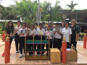 The withdrawn books were then donated to local schools. One is a temple School in Ayuttha called Wat Khai. Marivic and I took several boxes to them. They were so excited that we were required to pose in front of the flag pole with the boxes (& some shelves)