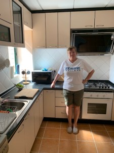 Note how low the units are in relation to me. I think that they were made for the Asian build and not towering westerners! I am not tall but even I have to stoop slightly when chopping things up!!! Surprisingly there is a double sink but no draining board.