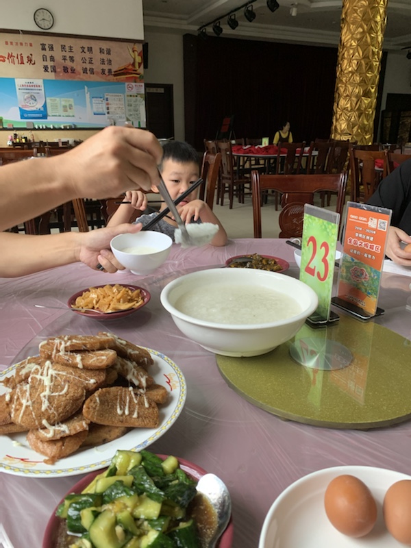 Breakfast was traditional Chinese so no tea or coffee, just water to drink and congee to eat which is a very bland watery rice porridge. This can be flavored with a sort of scrambled egg or vegetables. It was all extremely healthy!