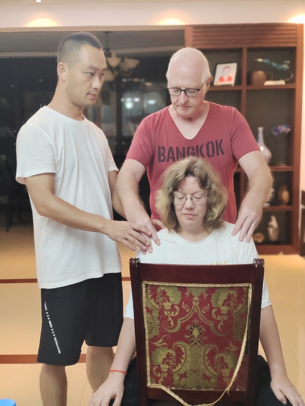 The evening was chinese massage and here Kevin is being shown the correct position.