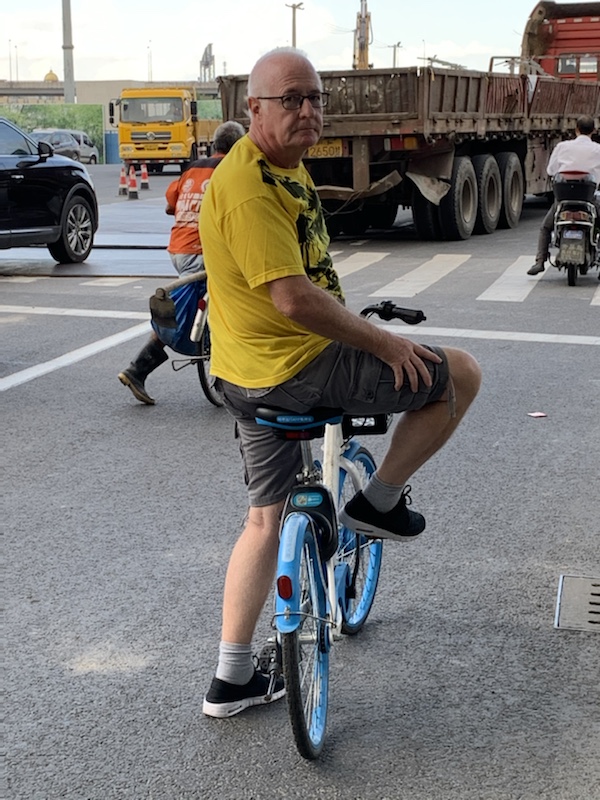 Even easier that London’s Boris Bikes, you simply scan the QR code at the back and it unlocks. There is a little whirring noise and a voice says ‘Hello Bike’ (in English) then some Mandarin that we don’t understand and off you go.