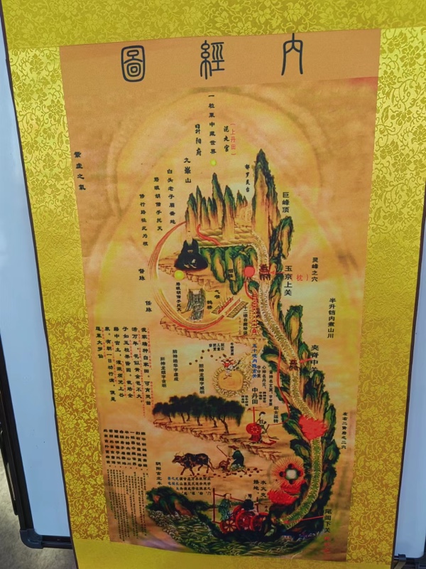It is mounted here on royal yellow to show that it is a special and significant image. The drawing was made many thousands of years ago before modern science but it depicts how the energy (qi) moves around the body, to which organs and in which order. When people have emotional problems such as fear it is the result of an inbalance or blockage on one of the organs (or systems of organs) and conversely, if there is too much of a certain emotion it can cause damage to that organ. Anger, for instance is associated with the liver and spleen. Fear in the heart and Lungs.